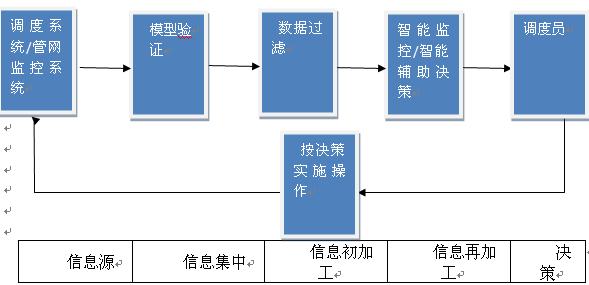 從信息流的角度說,輔助決策系統應該涵蓋整個信息處理的過程。從初始的網絡分析的生成和驗證,到采用調度數據集成技術,有效整合并綜合利用生產、管網的運行信息,再經過數據過濾,獲取一個可靠的數據鏈,以此為基礎實現系統正常運行時的監測,并能對異常情況進行智能辨識,分析、給出決策方案。如下圖: