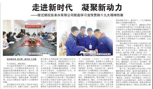 “公司黨總支始終把學習宣傳貫徹黨的十九大精神做為頭等大事。”中共宿遷銀控自來水有限公司黨總支副書記陳少軍說,公司黨總支多次下發通知,為各分公司、各部門、區域供水服務中心量身定制十九大精神學習宣貫方案。特別是對領導班子、分支機構、廣大員工“三個層面”深學原文、深悟原理、深研要義以及特色主題活動開展等方面進行了重點要求和部署,使學習、宣貫黨的十九大精神有了“路線圖”和正方向,為全面學習好、宣貫好黨的十九大精神奠定了堅實基礎。