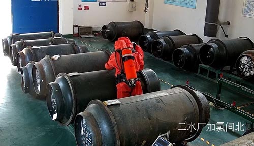 13日下午15:00,演練正式開始,隨著漏氯警報聲響起和漏氯吸收裝置的啟動,制水部值班人員立即佩戴防毒面具進入到氯庫區(qū)域查看,檢查氯氣泄漏情況,確定氯氣泄露后,立即向部門經(jīng)理朱曉成匯報,朱經(jīng)理在接到報告后,一邊組織制水部值班人員做好應(yīng)急處理準(zhǔn)備,一邊向公司領(lǐng)導(dǎo)趙總報告。在得到趙總授權(quán)處置指令后,啟動公司液氯泄露應(yīng)急預(yù)案。首先安排兩名應(yīng)急處置人員穿戴B級防護服和正壓式空氣呼吸器進入氯庫進行查漏處置,3分鐘后在查出漏點,并做好標(biāo)記后,處置人員立即實施堵漏,5分鐘后,堵漏完成,并消除了警報。整個演練過程,從發(fā)生報警開始到時處置完成,共17分鐘,在這17分鐘內(nèi),應(yīng)急人員完成了匯報情況、穿戴PPE、查找漏點、封堵漏點等工作,顯示出此次漏氯實戰(zhàn)演練的各項應(yīng)急措施比較到位、流程很熟練。