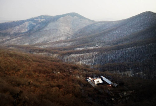 進入景區立刻明白皇藏峪“峪”之意,沿著山谷主路步行而上,到達瑞云寺后路開始變得陡峭,原本可以行車的路變成了石階和木質棧道。寒冬時節,整個山體顯得草木蕭疏,加上未完全消融的積雪,更加顯得蒼勁。因為景區屬落葉闊葉林,是原始森林,千年古樹隨處可見。山上幾乎全是裸露的巖石,樹木從巖石縫間盤根錯節,青檀,南京椴這些長達千年的樹木,盤虬臥龍,顯示出頑強的生命力。沿著階梯拾級而上,路過拔劍泉、皇藏洞這個主要景點,都有著關于項羽和劉邦楚漢相爭的典故。最后到達海拔389米的平頂山觀景臺,向下望去瑞云寺顯得的矚目,是整個山景的點睛之筆。
