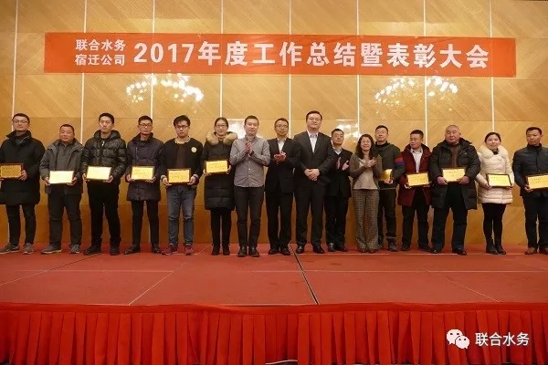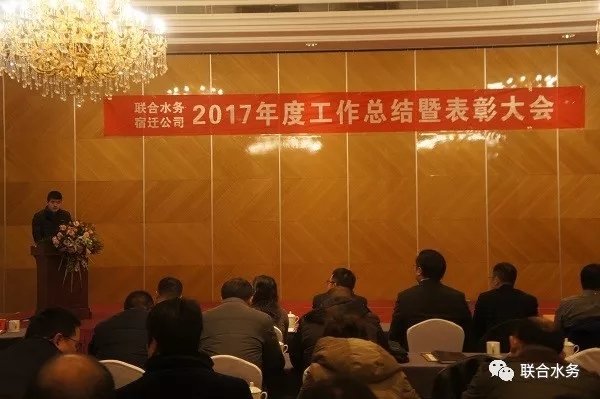總結過去,展望未來,砥礪奮進,再譜華章。2018年2月10日上午,聯合水務集團宿遷銀控自來水有限公司2017年度年終總結暨表彰大會隆重召開,聯合水務集團供水業務副總裁劉猛先生、污水業務副總裁陳樵先生,財務總經理陳國清先生、人事行政總監楊麗霞女士、生產運營總監王歡先生以及宿遷銀控自來水有限公司、宿遷聯合市政工程有限公司、宿遷市民信水質檢測有限公司、宿遷耿車污水處理有限公司、宿遷雙莊聯水污水處理有限公司主管以上人員、先進員工、員工代表共計76人參加了會議,會議由宿遷銀控自來水有限公司副總經理陳少軍主持。聯合水務集團領導的親臨受到了大家的熱烈歡迎。