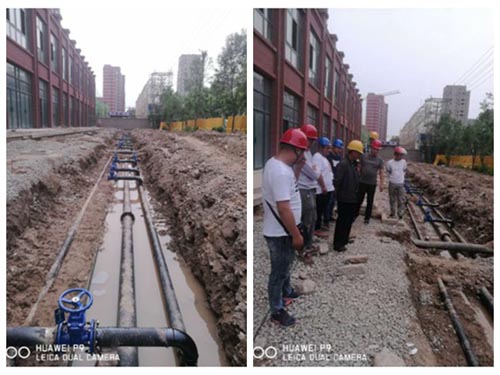 “香格里拉”現場的施工場地較為寬闊,管溝開挖的寬闊筆直。現場各管道布管筆直平行,同一高度,中間管距大概50公分,不但美觀大方,并且施工起來有足夠的操作空間,易于施工,可以保證施工的質量。管道的焊縫都在一條直線上,并且焊縫平整飽滿,數十條焊縫如一,說明施工的時候認真負責,焊接要求很高。消防入戶管的閘閥也在一條直線上,視覺上很有沖擊力,就好像是同一個模子刻出來一樣,待工程完工,整齊的閘閥井可以為市容市貌增添光彩。入戶管道嚴格按照要求用彎頭向上挑,整齊劃一,煞是好看。施工現場有多方施工隊交叉施工,施工環境復雜,在這樣的情況下,能做到這樣完美,實屬不易。