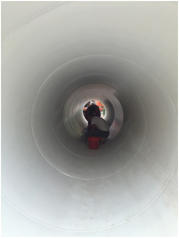 DN1400給水主管道為大口徑管道,不可能像一些小口徑管道那樣在工程全部施工結束后,全部使用自來水進行沖洗,為確保供水安全,在施工過程中保持管道的清潔特別重要。具體要求工程施工過程中,不僅要求下管前就需保持內部清潔,下管后管道若受污染需再次進行人工擦洗。防止雨水泥水的影響也是一道重要工序、工程階段性完工與其他管道對接前還需進一步確認管道內部清潔情況等,為此施工人員付出了大量的勞動。