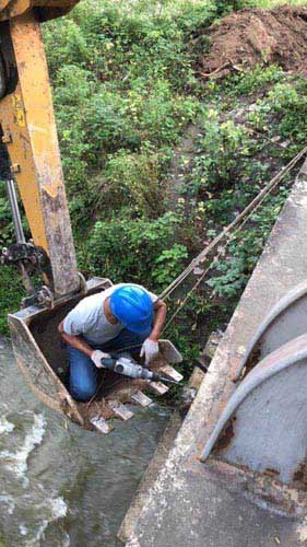 正所謂“眾人劃槳開大船”,雖然難度很大,但在場的維修員協調合作,眾志成城,熱火朝天地投入搶修工作中。時間就這樣在繁忙且艱巨的搶修工作中一點一點地過去了,下午14時左右,龍河中心備好搶修材料準備開始焊接。但天公不作美,再次下起了瓢潑大雨,焊接管道就無法露天進行。15時左右,大雨驟停,所有維修員立即嚴陣以待,各司其職,搶修工作繼續有條不紊地開展起來。第一個難題順利解決,迎面而來的是第二個難題,由于操作空間,操作環境十分復雜,如何固定管道。經過認真分析,決定由一名維修師傅將繩子系在腰間,蹲在挖機里進行操作。或許,在看風景人的眼里橋下的風景很美,但在維修員眼中,這是一場技術、勇氣與惡劣環境的較量。