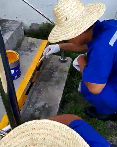 在污水廠安全生產經營活動中,警示標線的作用顯得尤為重要。近期,耿車污水廠生產人員針對室外的警示標線容易脫落的情況進行了分析,最終決定在需要警示的地方用黃色油漆噴涂警示標線。在耿車污水廠,大部分池體都很高,樓梯是生產人員攀登到池體上的唯一通道。在夜間或是惡劣天氣的情況下,爬樓梯就需要特別注意安全,因此有必要把樓梯的底部臺階涂上黃色警示標線,以此來提醒生產人員注意安全。除此之外,在池體上面的機械設備四周、在走道邊鋪設橋架的突出部分、在儀表設備控制箱支架的底部、在固定水下設備的導桿旁等所有需要警示的地方,我們都需要涂上黃色警示線。