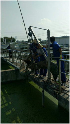 此次檢修,重點解決前期不具備維修條件但對生產有重要影響的設備。如在前期巡檢過程中發現,生化池推流器已經脫離基座,沉于池底,位置不能夠確定。生化池的潛水推流器對生化池污水流動起到至關重要的作用,由于該設備放置于池底,必須要對現有池體進行清空,但倒池會影響整個污水系統。針對此情況,在運行人員的配合下,機電部當機立斷決定,使用最便捷有效的方法——使用強性磁鐵確定設備所在位置,再使用鋼鉤鎖住設備。經過四天的不斷嘗試,終于將設備提出水面。