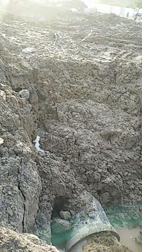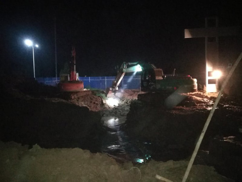 晚上19時,開始關閉閘閥,挖掘機進場開挖。天色太黑,為避免作業機械對管道造成二次破壞,搶修人員只能采取逐步逐點深挖的查探方式尋找漏點準確位置。經過幾個小時的奮戰,終于定位漏點,搶修人員立即開始管道膠圈對三段脫節的管道進行對接。因管道口徑大,施工難度也較大,直至凌晨3時許,管道終于對接完成,進入沖洗環節。沖洗過程中,水質檢測人員進場對水質進行檢測,以保證讓用戶用上安全、衛生、放心的自來水。經過不斷沖洗,至5時40分終于將濁度從2.05NTU降低至0.95NTU(符合小于1.0NTU的國家標準),水質合格,具備供水條件。