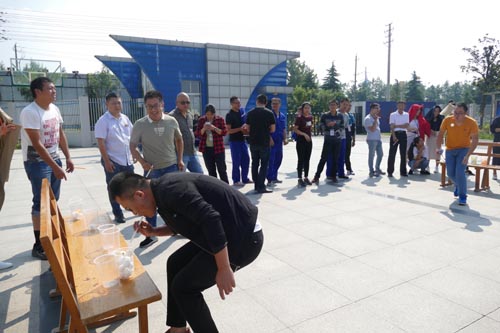 第二個環節是單人項目“運送小球”。參賽隊員通過吸管吸住乒乓球(比賽全程不得用手觸碰乒乓球,運球途中,乒乓球落地,則返回原地重新開始)將乒乓球送到指定地點杯中,賽程2米,2分鐘時間內運送乒乓球的個數計為成績。4人一組同時比賽。剛開始,財務部經理許應濤以13球的好成績暫居第一,他正沾沾自喜,后邊的選手卻不服氣揚言要挑戰,嬉笑斗鬧,如火如荼。果然,第四組次,皂河服務中心韓小東以16球打破紀錄,許經理眼看奪冠無望,在大家調侃聲中“灰溜溜”離場。接下來的比賽現場,熱鬧依舊,一個個隊員屏住呼吸,憋住氣,全神貫注地運球,完全進入忘我狀態,但是也有很多人經不住場外人員的玩笑逗鬧,忍不住笑起來,小球就趁機逃脫了,技術部薛江寧經理就屢屢中招,每到中途球就掉落,慌忙去逮球,不時惹得在場人員捧腹大笑,最終也沒能實現“零”的突破。而同組次的徐曉猛,卻是一匹“黑馬”,成功送進17球,拔得頭籌。結果是其次的,重要的是歡樂開懷、努力拼搏的過程。