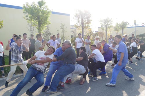 在陣陣歡呼聲中,輕松愉悅的套圈游戲結束了。緊接著就是令群情激奮的壓軸大戲,也是每年國慶活動的傳統團體項目——拔河比賽。本次拔河比賽共分4隊:工程公司代表隊、生產技術聯隊、客服運營聯隊及行政辦公與污水處理聯隊,每隊15人(女隊員不低于5人),采取抽簽方式捉對 “廝殺”,三局兩勝。在兩組勝方中再決出冠軍。經過第一輪比賽,行政辦公聯隊、工程公司隊惜敗,生產技術聯隊、客服運營聯隊晉級。雖然奪冠無望,但是,行政辦公聯隊與工程公司代表隊決意為榮譽而戰!分管污水項目的總經理助理蔡猛親自披掛上陣,帶領隊伍一舉擊潰工程公司對,終于擺脫了千年“吊車尾”的帽子!接下來,迎來了全天比賽的重頭戲:冠軍大戰!由生產技術聯隊迎戰客服運營聯隊。強強對決,勢均力敵,雙方隊員虎視眈眈,以“箭在弦上,一觸即發”之勢,準備做最后一搏。哨聲一響,領隊的號子聲、隊員的吶喊聲、啦啦隊的助威聲響徹云霄。盡管生產技術的猛將巾幗奮力拼搏,奈何對手經驗豐富,實力雄厚,在領隊顧全局經理的指揮下,象征勝利的掛繩最終越過標線,客服運營聯隊以2:0的絕對優勢獲得最終的勝利。