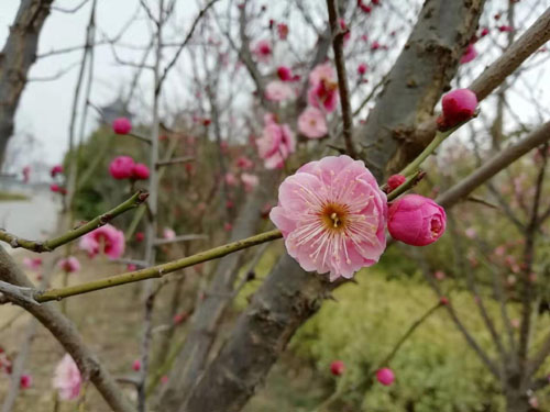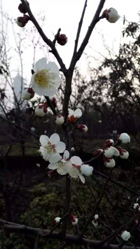 “疏影橫斜水清淺,暗香浮動月黃昏。”順著淡淡花香尋覓,映入眼簾的有紅色的、粉色的,還有白色的梅花都爭相競放了。不由自主地湊近了它們,只見嬌嫩的花朵在寒風中含笑嫣然,似乎不染人間一點的煙塵,那樣的疏秀清韻,淡淡的清香撲面而來,即刻令人神清氣爽。旁邊的小片竹林里的竹子們搖擺著碧綠碧綠的小手,和梅花互相呼應著,那份悠然自在,相得益彰,真是一幅美麗的天然畫卷。