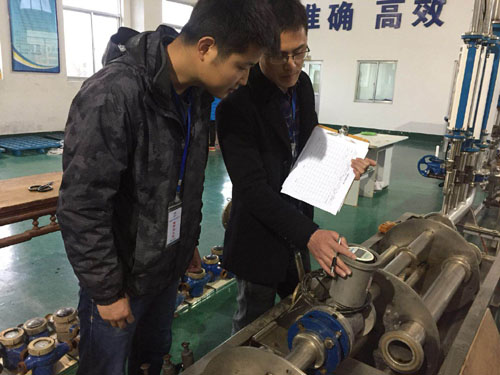 (圖:檢定人員和電磁水表技術人員檢定電磁水表)