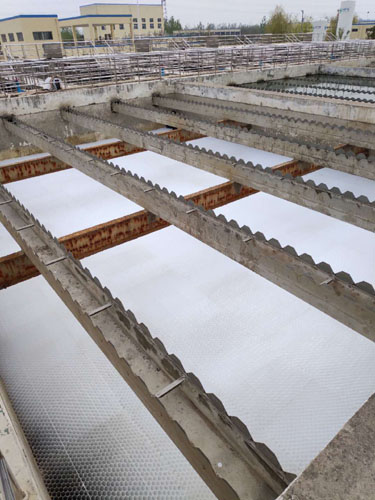 制水部二水廠一期斜管沉淀池運行中發現斜管支架出現坍塌,影響沉淀池正常運行使用,為確保安全生產、優質供水,公司立即安排對一期三組沉淀池斜管進行全部更換。