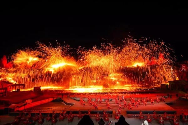 表演正式開(kāi)始了,這是一個(gè)大型的表演型節(jié)目,分為幾個(gè)情節(jié)來(lái)表演,隨著幾聲雞叫聲,農(nóng)戶的窗戶亮了,農(nóng)民起床開(kāi)始生火、燒鐵,打鐵聲叮叮當(dāng)當(dāng),瞬間讓人感受到那種與世無(wú)爭(zhēng)、自然和諧的生活情趣。中間穿插幾個(gè)舞蹈,賣鋼針等表演,最后是壓軸大戲“澤州打鐵花”。只見(jiàn)在假山頂上、半山腰上有幾十個(gè)赤膊壯漢,隨著音樂(lè)響起或喊起號(hào)子一起將鐵花打向十幾米的天空、或此起彼伏的輪流將鐵汁拋灑向高空,鐵汁花帶著1600攝氏度的高溫,從天空劃著優(yōu)美的弧線灑向大地,到地面再次碰撞濺起,或落入水中,響起爆炸聲響,顏色也是姹紫嫣紅,整個(gè)天空都被渲染,宛如火樹(shù)銀花、金蛇飛舞,又如煙花般綻放,是力量和技巧的完美結(jié)合,聲勢(shì)之浩大、畫面之優(yōu)美,美輪美奐,無(wú)以倫比。