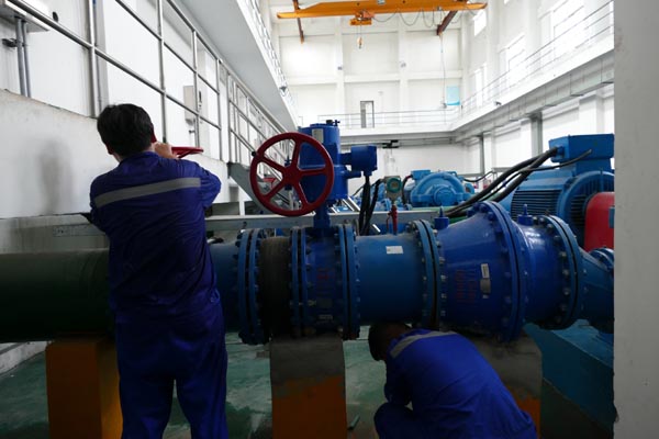 河湖連通工程全面完工并已投入運行,確保原水供應安全。目前,宿遷銀控自來水有限公司以駱馬湖為主水源,中運河為備用水源。為保證兩個水源互連互通,互為備用,公司投資近九千萬元人民幣,建設“河湖連通——應急水源工程”,河湖連通泵站總規模38萬噸/日,原水可同時取用駱馬湖和京杭運河,亦可同時輸送到一水廠和二水廠。目前,該工程已全面竣工,并投入運行,與駱馬湖泵站互為備用,有效應對水源惡化或水源污染等突發事件,極大提高了供水保證率和應急供水能力。