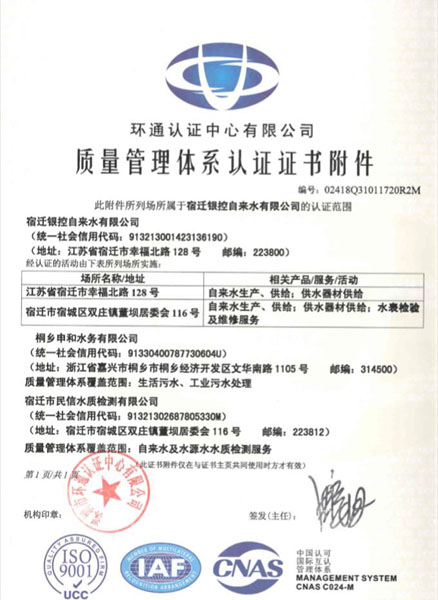 近日,深圳環通認證中心有限公司為宿遷銀控自來水有限公司頒發了三大體系的認證證書,標志著宿遷公司本年度三大體系的擴大認證范圍工作順利完成。宿遷公司自2012年通過三大體系的認證以來,至今已經歷兩次重新認證,五次監督審核,今年還進行了擴大認證范圍工作,截至到目前為止,宿遷公司的認證范圍包括:自來水生產、供給;供水器材供給;水表檢驗及維修服務;生活污水、工業污水處理;自來水及水源水水質監測服務。