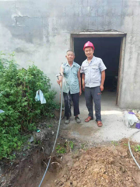 穿過泥濘的小路、臟亂的垃圾站和一片農田,一行人終于抵達老人的家。屋內家徒四壁,悶熱潮濕,墻腳堆積老人多天換下來的臟衣服。老人說,之前用水都是到附近的鄰居家挑水,一個人用水不多也不算困難,現在天氣炎熱,用水量大,挑水就非常不便。看到眼前的景象,在場的人無不深受觸動,客服部副經理陳美菊耐心溫和地安撫老人的情緒,并將老人的情況向公司領導報告,公司領導當即電話指示:免去一切安裝費用,立即為老人家安裝自來水。管網部副經理韓超當即組織人員進行管網勘查,確定安裝方案,安排維修員申領材料,開展安裝工作。