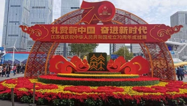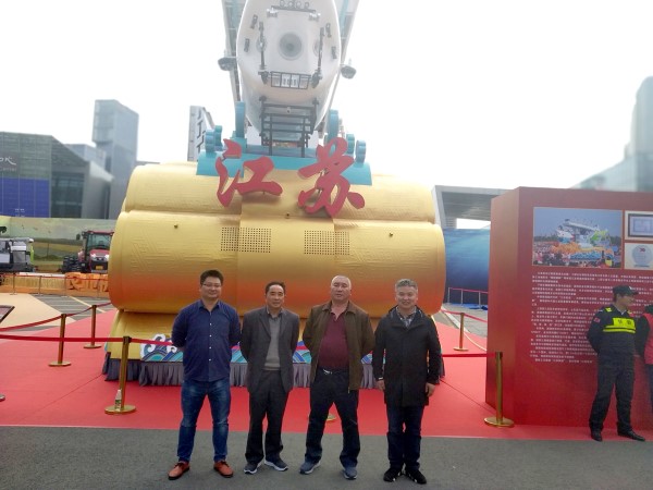 通過安檢,首先進入室外展區(qū),正前方映入眼簾的此次展會的大型主題“新贊新中國 奮進新時代”的主題展區(qū),在花團的簇擁下展會的主題格外的醒目,彰顯新中國成立70周年來,在中國共產(chǎn)黨的領(lǐng)導(dǎo)下江蘇省走過的輝煌且不平凡的發(fā)展歷程。順著參觀通道,我們來到了剛參加完國慶70周年閱兵,主題為“江蘇智造”的江蘇巡禮彩車前。彩車長15米,寬3米,高近6米。在彩車上布滿了 “蛟龍?zhí)柹顫撈鳌薄ⅰ吧裢売嬎銠C”、“智能工程機械”等富含各種元素的江蘇省的科技發(fā)展成果,彰顯“大國重器”的時代使命。接著,由江蘇省科研院所和企業(yè)參與設(shè)計和制造的各種高科技工程機械、農(nóng)業(yè)設(shè)施、航天科技、新能源產(chǎn)品在各自展臺展出,顯示了江蘇省在科技前沿領(lǐng)域的“芯”實力、“芯”科技、“芯”成果。
