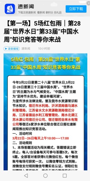 受疫情影響,今年宿遷市的“世界水日”、“中國水周”宣傳活動采用線上方式扎實開展,方式新穎且力度不減。經(jīng)過前期合辦單位的用心籌劃,圍繞今年國家水利部確定的“堅持節(jié)水優(yōu)先 建設(shè)幸福河湖”的宣傳主題,系列宣傳活動以別開生面、匠心獨具的六大方式精彩呈現(xiàn),提高全市人民節(jié)水、護(hù)水、愛水意識,形成全員參與、共創(chuàng)水生態(tài)美好家園的良好氛圍。